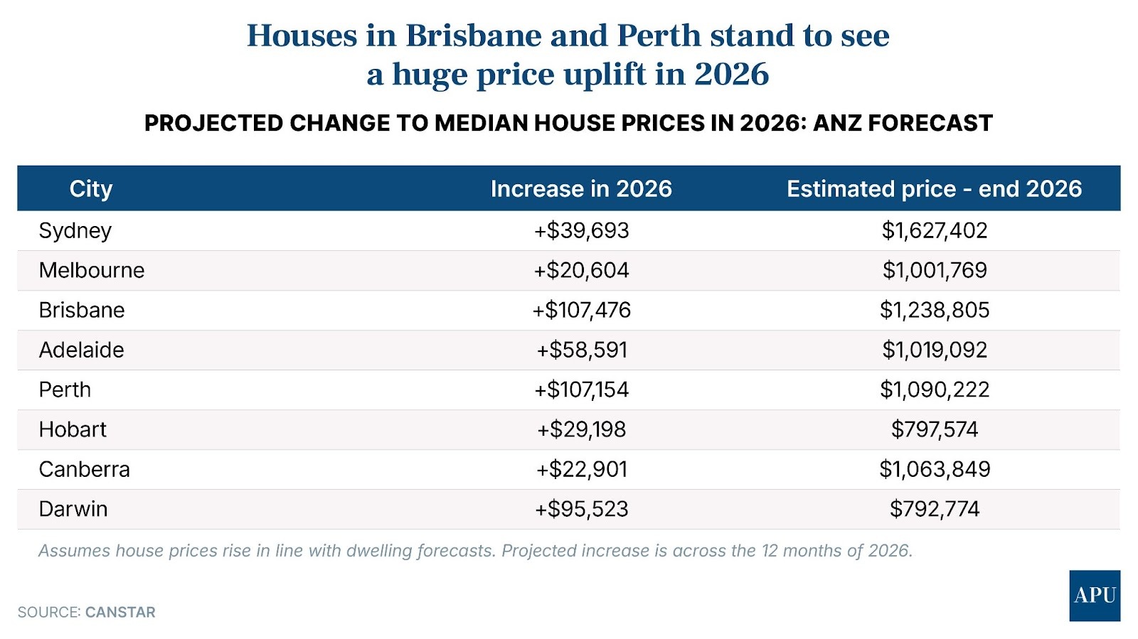 - Analysis by Canstar suggests median house prices in Brisbane and Perth could rise by more than $100,000 in 2026 alone
